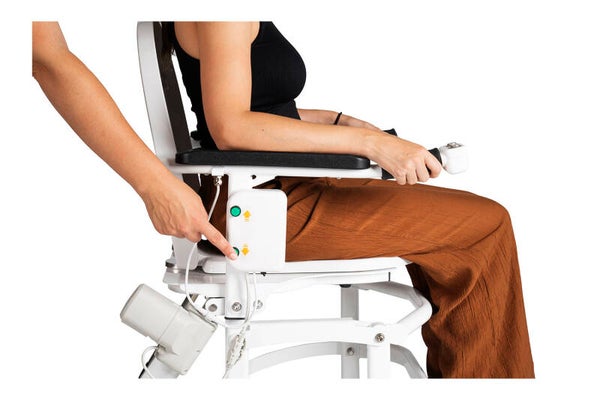 Este asistente para inodoro permite ajustar la elevación o descenso del mismo desde el mando situado en el reposabrazos o desde el panel de control.